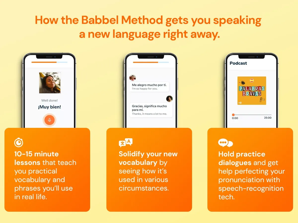 Our team of 200+ linguists crafted Babbel’s lessons so you learn the phrases you’ll actually use, while our AI-powered speech tools correct your pronunciation instantly. Hundreds of thousands have seen life-changing results using these exact strategies, and you can too.